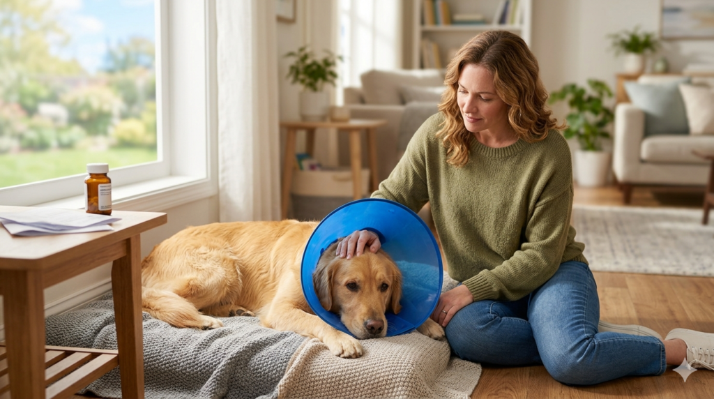 The first day home after vet surgery is about anesthesia recovery, not wound healing. Your dog may be groggy, unsteady on their feet, and uninterested in food. Some dogs whimper or vocalize as the sedation wears off — this doesn’t necessarily mean they’re in pain, though it can indicate discomfort. Offer water in small amounts. Feed half a normal portion of bland food if they show interest. Don’t force it.